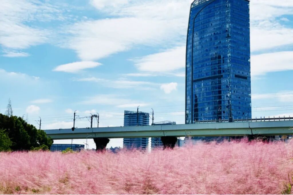 當(dāng)11號(hào)線(xiàn)列車(chē)從遠(yuǎn)處軌道緩緩駛來(lái),車(chē)身與粉黛花海形成鮮明卻和諧的對(duì)比:列車(chē)的金屬質(zhì)感帶著現(xiàn)代交通的利落,而成片的粉黛亂子草如粉色綢緞般鋪展在地面,粉紫色花穗在微風(fēng)中輕輕搖曳,仿佛在以柔軟姿態(tài)迎接列車(chē)的“到訪(fǎng)”。