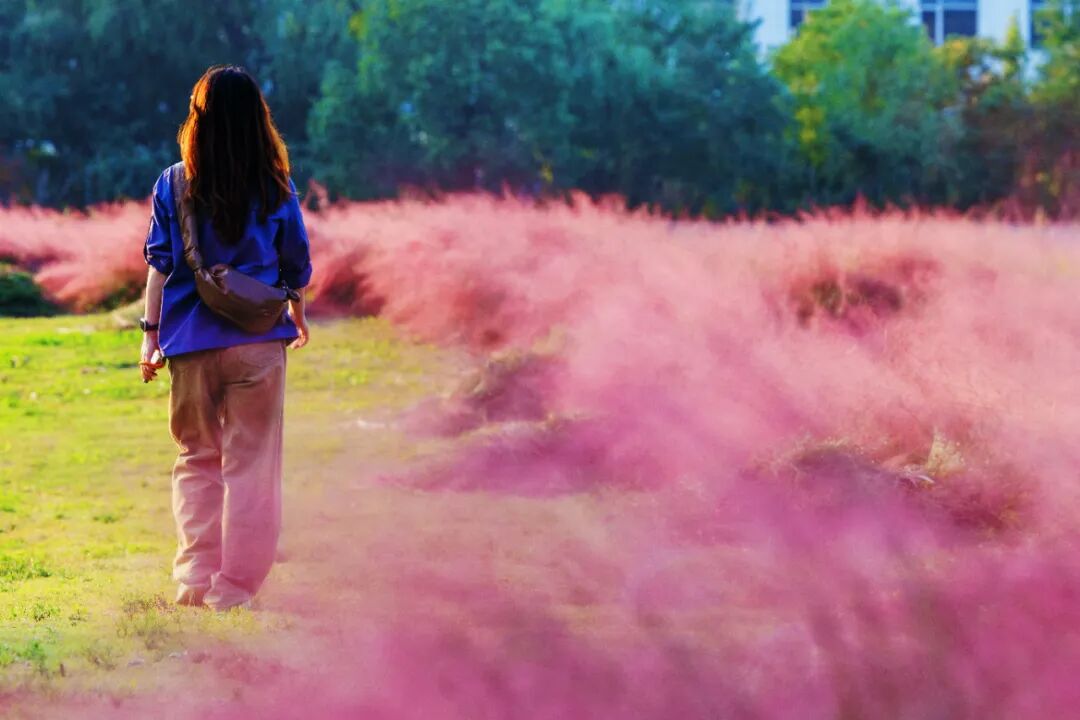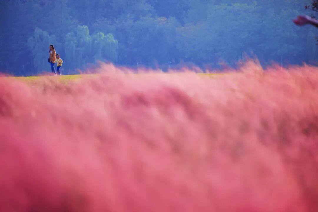 每到周末或傍晚,不少游客帶著家人、朋友前來(lái)打卡,有人穿著淺白、米黃的衣物站在花海步道旁,以粉色為背景定格笑容;有人舉著相機(jī)捕捉逆光下花穗的朦朧美感,歡聲笑語(yǔ)為這片花海增添了更多生機(jī)。