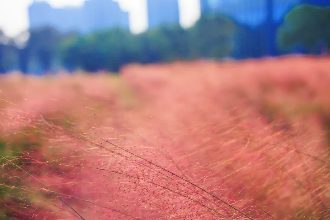 粉黛亂子草作為禾本科亂子草屬的多年生草本植物,株高可達(dá)30-90厘米,原產(chǎn)于北美大草原,如今已成為國(guó)內(nèi)城市秋季景觀的“??汀?。此時(shí)的中央公園內(nèi),成片的粉黛亂子草以鮮嫩的翠綠為底,無(wú)數(shù)粉紫色花穗從基部輕盈舒展,如蓬松的發(fā)絲般垂落。