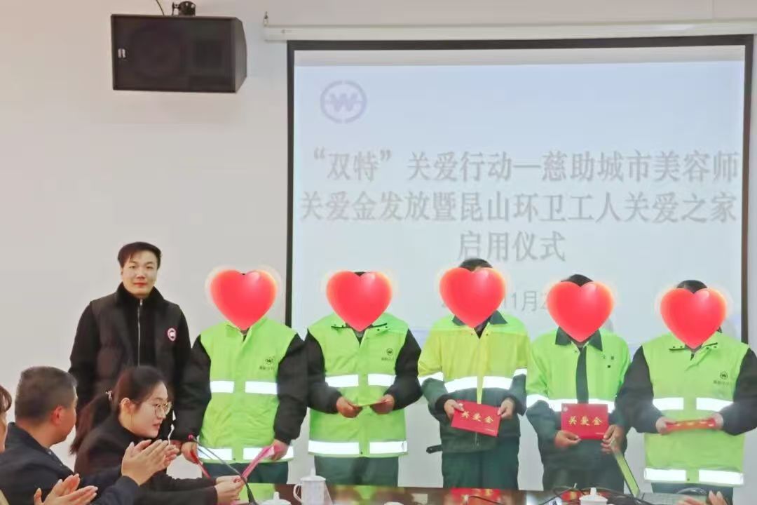 11月21日,慈助城市美容師關(guān)愛金發(fā)放暨昆山環(huán)衛(wèi)工人關(guān)愛之家啟用儀式舉行。現(xiàn)場,13名家庭生活較為困難的環(huán)衛(wèi)工人收到關(guān)愛金。