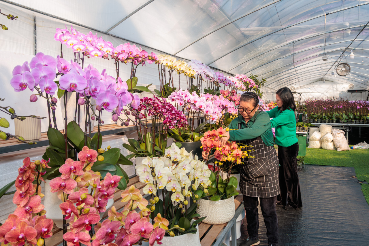 步入這座現(xiàn)代化智能溫室,瞬間被一片斑斕的花海淹沒。深淺各異的粉、純凈無瑕的白、明亮耀眼的黃,在翠綠葉片的襯托下,交織出一幅動(dòng)人的冬日畫卷。花叢中,工人們正細(xì)心照料這些嬌貴的“花中仙子”,為即將到來的年宵花市場(chǎng)做準(zhǔn)備。