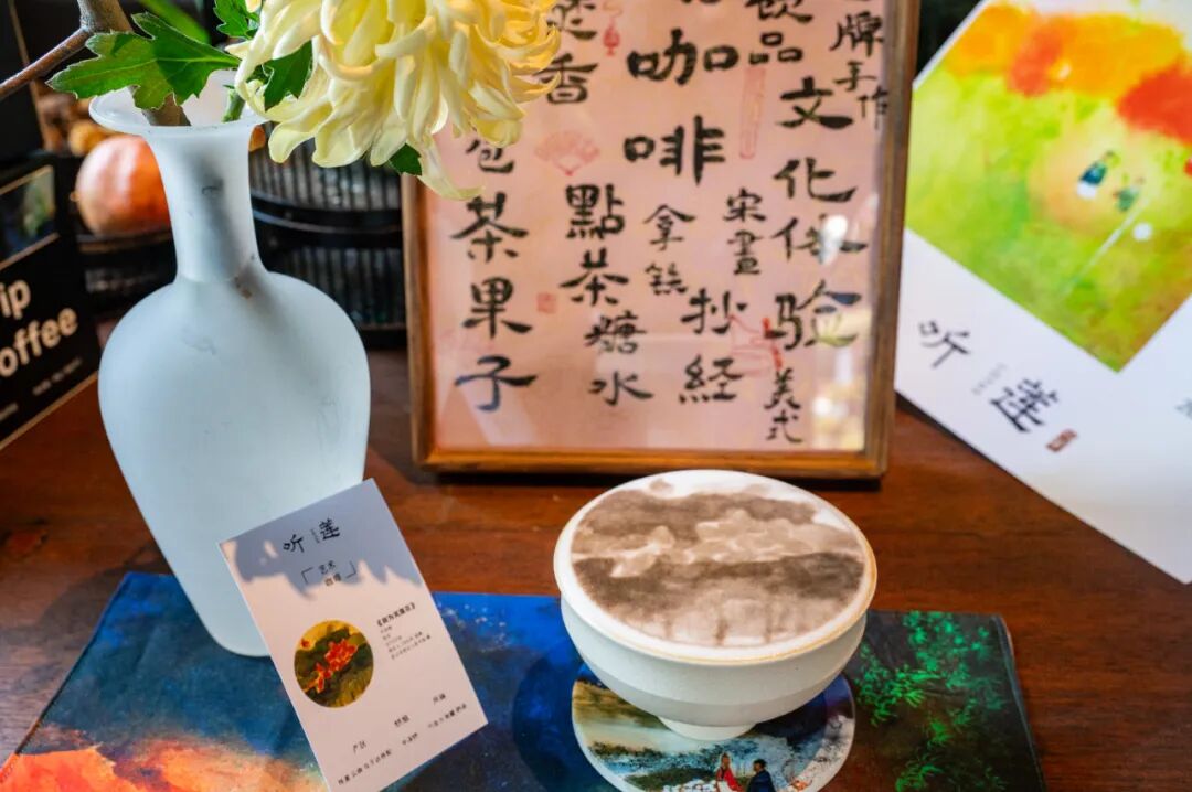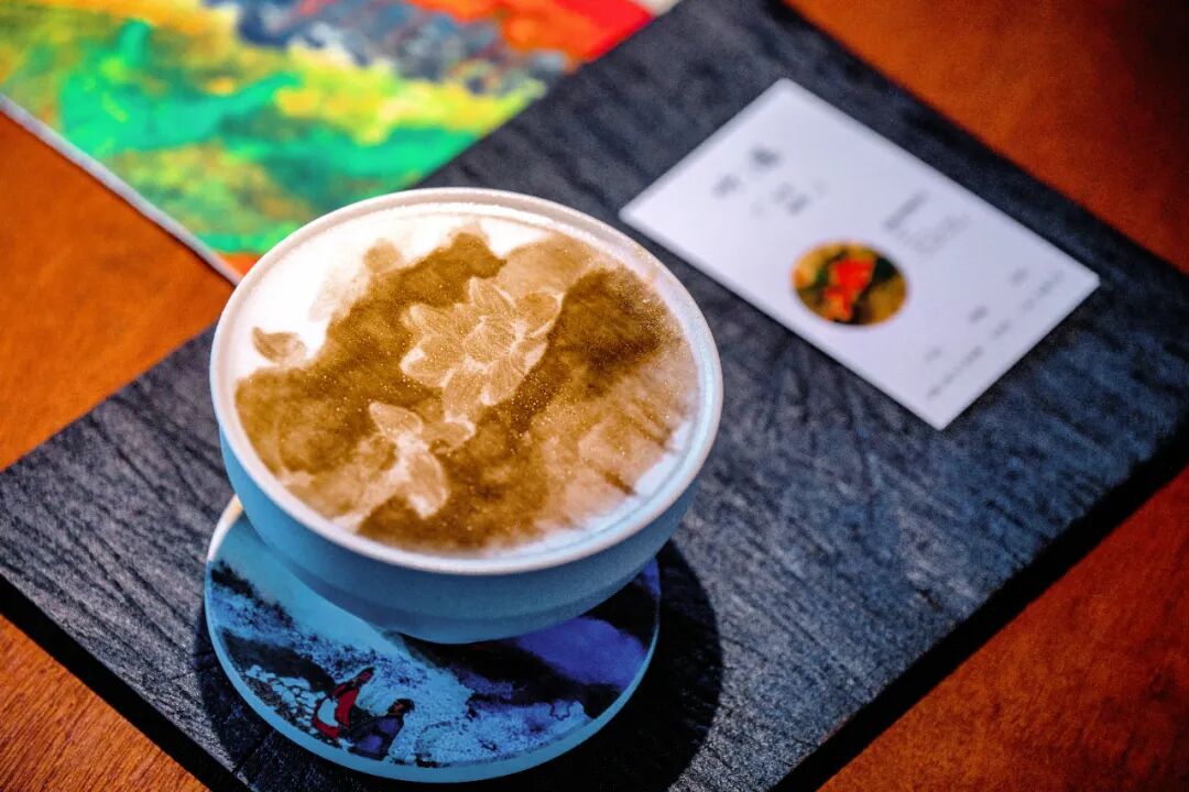 藝術(shù)不僅可看可把玩,還可“入胃”。走進(jìn)古色古香的“聽(tīng)連學(xué)社”,每張咖啡桌上都擺放著一張侯北人的小型復(fù)制畫,前臺(tái)呈放系列文創(chuàng)產(chǎn)品。更讓人印象深刻的是,店內(nèi)還特別推出一款侯北人經(jīng)典畫作《荷為芙渠》的聯(lián)名咖啡,利用可食顏料,將畫面打印到咖啡中,給游客不一樣的“藝術(shù)食用”體驗(yàn)。